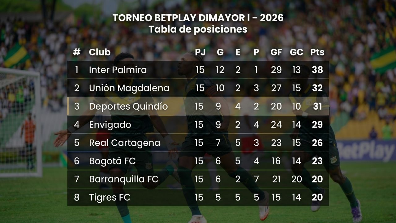 Deportes Quindío derrotó este sábado 18 de abril a Tigres Fútbol Club por marcador de 1-0 en el Estadio Metropolitano de Techo, en Bogotá, en partido correspondiente a la fecha 15 del Torneo BetPlay DIMAYOR I-2026. Con el resultado, el equipo de Armenia cerró la fase de todos contra todos en la tercera casilla de la tabla, con 31 puntos en 15 jornadas disputadas.