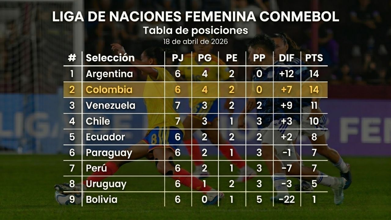 La selección Colombia igualó sin goles con Argentina este sábado 18 de abril de 2026 en el estadio Ciudad de Lanús, por la séptima fecha de la Liga de Naciones Femenina CONMEBOL. El resultado deja a ambas selecciones con 14 puntos, las únicas invictas del torneo, pero Argentina conserva el liderato por diferencia de goles (+12 frente a +7), y la definición del cupo directo al Mundial de Brasil 2027 queda pendiente para la última ventana FIFA de junio.